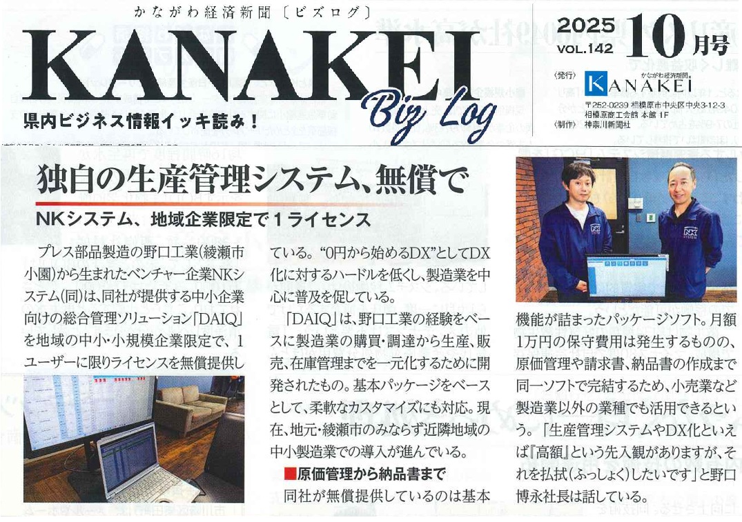 「かながわ経済新聞」2025年10月号へ掲載いただきました。 News 2025.10.16 「かながわ経済新聞」2025年10月号へ掲載いただきました。 弊社の生産管理システムを地域限定にて1ライセンス無料でご提供いたしております。 ぜひお問い合わせフォームからご相談ください。 お問い合わせフォーム